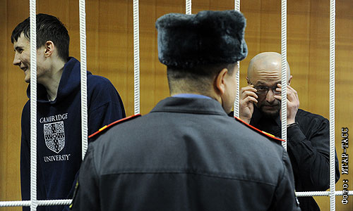 Кирилл Унчук и Руслан Хубаев (слева направо), один из обвиняемых по делу о беспорядках на Манежной площади в декабре 2010 года, в зале заседания Тверского суда.