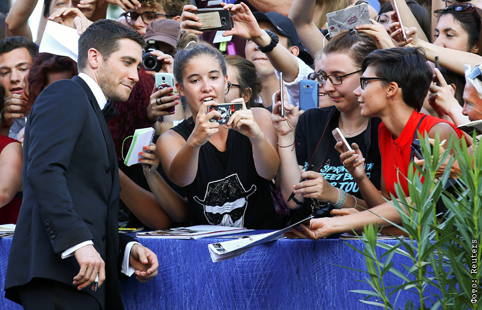 Актер Джейк Джилленхол раздает автографы на красной ковровой дорожке Венецианского кинофестиваля