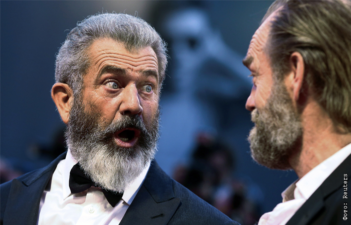 Голливудский актер и режиссер Мел Гибсон и актер Хьюго Уивинг на премьере военной драмы "По соображениям совести"