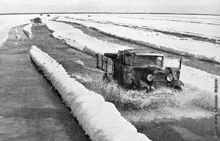 Проложенная по льду Ладоги "Дорога жизни", по которой были доставлены тысячи тонн продовольствия, боеприпасов и топлива в осажденный Ленинград. 1943 год.