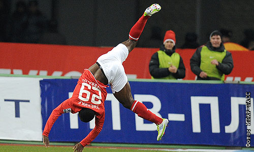 Игрок "Спартака" Эммануэль Эменике, забивший гол, в матче чемпионата России по футболу: "Спартак" (Москва) - "Локомотив" (Москва) - 3:0.