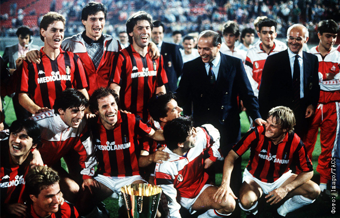 Владелец ФК "Милан" Сильвио Берлускони празднует с командой победу в Суперкубке Италии. 1989 год.