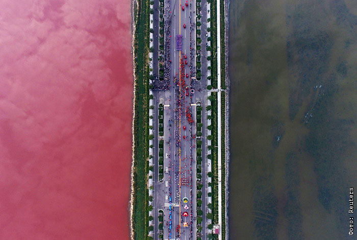Соленое озеро, окрашенное водорослями. Провинция Шаньси, Китай.