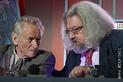 Член жюри премии председатель "Благотворительного фонда имени Артема Боровика" Генрих Боровик и телеведущий Андрей Максимов (слева направо) на церемонии вручения премии Артема Боровика