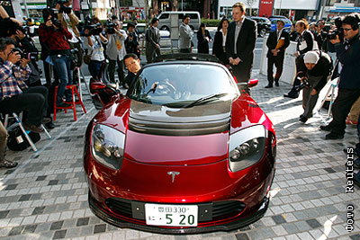 Президент Toyota Motor Corp. Акио Тойода представил в Токио новый двухместный электрокар Tesla Motor's Roadster