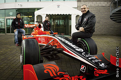 Пилоты команды "Формулы-1" Virgin Racing бразилец Лукас Ди Грасси, Тимо Глок и президент российской компании Marussia Motors Николай Фоменко (слева направо) после подписания контракта о покупке пакета акций гоночной команды F1 Virgin Racing