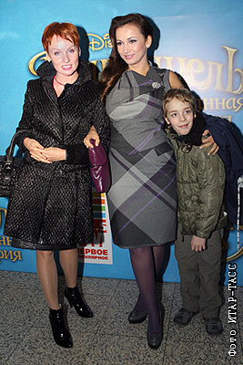 Актриса Жанна Эппле с сыном Ефимом и телеведущая Анфиса Чехова (слева направо) на премьере мультфильма "Рапунцель: Запутанная история" в кинотеатре "Октябрь"