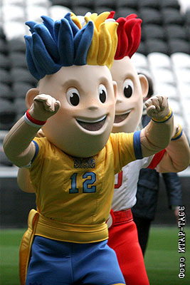 Талисманы чемпионата Европы по футболу 2012 года на поле стадиона "Донбасс Арена"