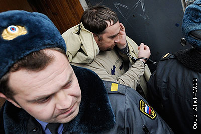 Бывший сотрудник УБОП ГУВД по Московской области Юрий Щербаков (на втором плане), подозреваемый в причастности к хищению 1,2 миллиарда рублей, принадлежащих Пенсионному фонду РФ (ПФР), в Тверском суде