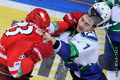 Игроки "Спартака" Кирилл Князев и "Югры" Алексей Пепеляев (слева направо) в матче чемпионата КХЛ: "Спартак" (Москва) - "Югра" (Ханты-Мансийск)