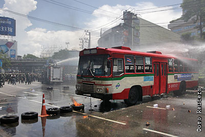Таиландские войска гасят автобус, подожженный антиправительственными протестующими в центральной части Бангкока