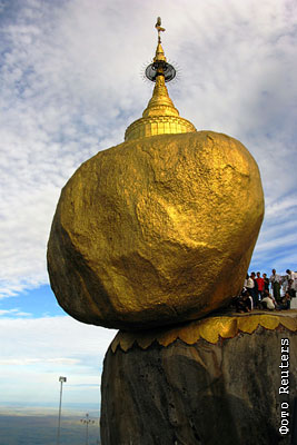 Буддисты ожидают своей очереди поднести золото к Золотой пагоде - одной из самых известных достопримечательностей Бирмы, ловко устроившейся на вершине огромного гранитного валуна, наполовину висящего над пропастью
