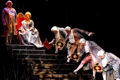Оперные певцы Алексей Шамбер (Алексей Бестужев-Рюмин) и Надежда Басаргина (императрица Елизавета) (на дальнем плане) в сцене из оперы в постановке Нины Чусовой "Екатерина Великая" в театре "Новая Опера". Опера представлена Театром музыкальной комедии Екатеринбурга в рамках фестиваля "Золотая маска"