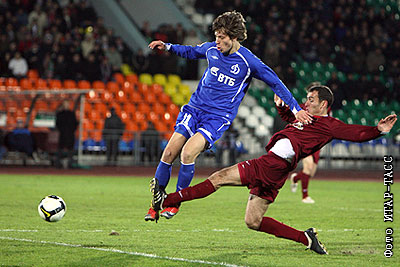 Игроки "Динамо" Федор Смолов и "Рубина" Лаша Салуквадзе (слева направо) в матче чемпиона России по футболу: "Рубин" (Казань) – "Динамо" (Москва) – 3:0