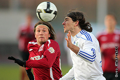 Игроки "Москвы" Бранислав Крунич и "Томи" Валерий Катынсус (слева направо) в четвертьфинальном матче Кубка России по футболу: "Москва" (Москва) - "Томь" (Томск) - 2:1