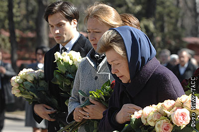 Вдова первого президента России Наина Ельцина с дочерью Еленой Окуловой и внуком Борисом у могилы Бориса Ельцина на Новодевичьем кладбище в день второй годовщины со дня его смерти