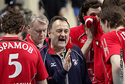 Игроки "Искры" Павел Абрамов, Александр Бутько и Йохан Шопс (слева направо в красной форме), тренер по физической подготовке Богдан Сретенович (слева на втором плане) и главный тренер Зоран Гайич (в центре) во время финального матча чемпионата России по волейболу: "Искра" (Одинцово) - "Зенит" (Казань) - 0:3