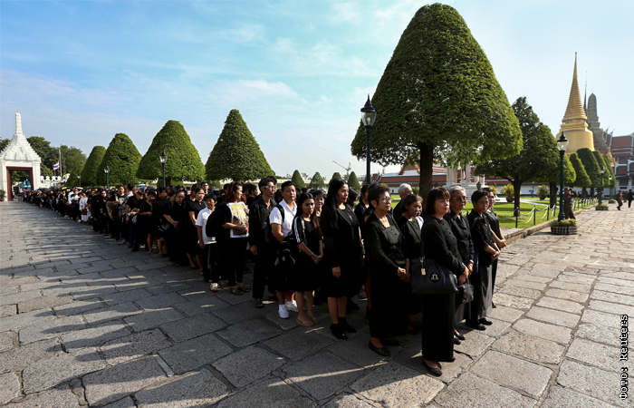С самого утра сотни людей собрались перед Большим королевским дворцом в Бангкоке, чтобы почтить память короля Пхумипона Адульядета