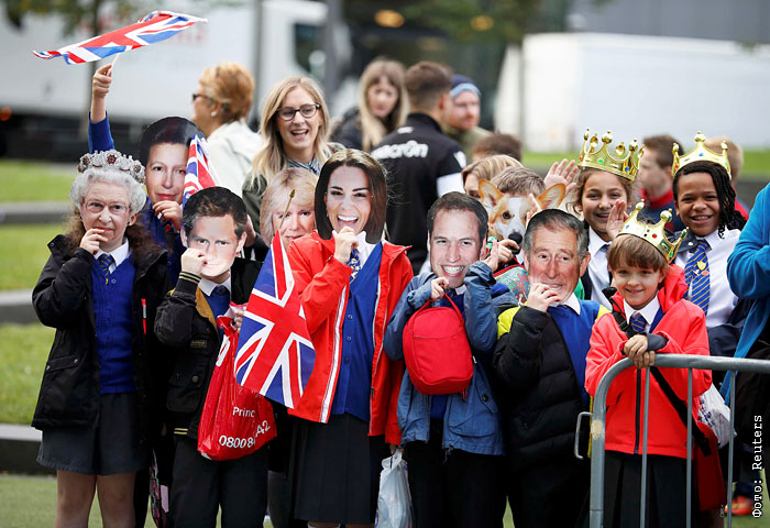 Британские школьники, изображающие членов королевской семьи, ожидают прибытия принца Уильяма и герцогини Кембриджской в Манчестер
