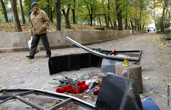 Жители Донецка приносят цветы к подъезду дома, где погиб один из командиров ополчения ДНР Арсен Павлов с позывным Моторола. Ополченец погиб в результате взрыва бомбы в кабине лифта в одном из домов города. Моторола находился в эпицентре взрыва и получил травмы несовместимые с жизнью.