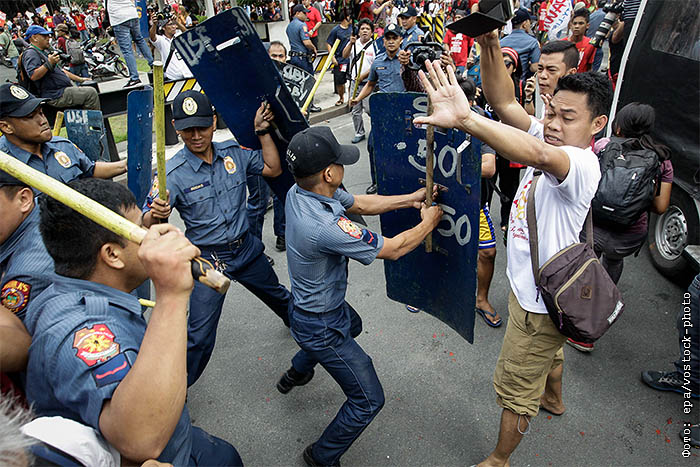 Жители Филиппин собрались у посольства США в Маниле и яростно требуют, чтобы американские солдаты покинули их родную землю. Власти реагируют задержаниями и попытками таранить толпу полицейским автомобилем. Пара десятков человек задержано, жертв, к счастью, нет.