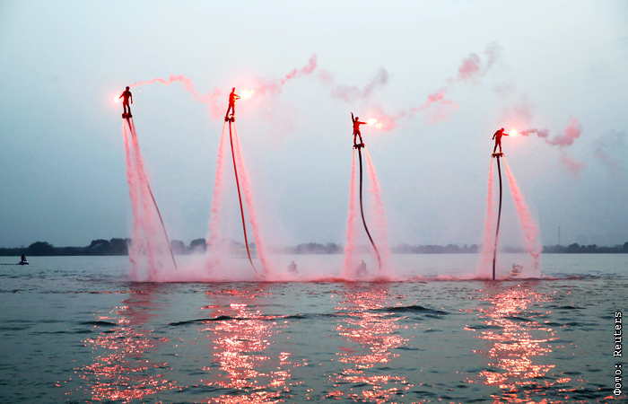 Водное представление на флайбордах в городе Исин, провинция Цзянсу, Китай