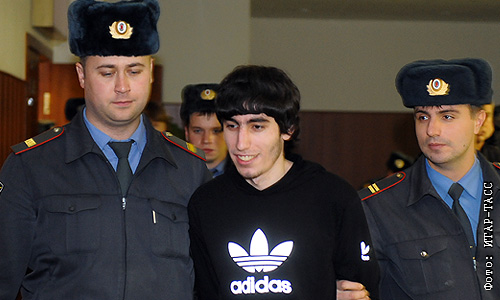 Ахмедпаши Айдаев (в центре), обвиняемый в убийстве болельщика "Спартака" Юрия Волкова, перед оглашением приговора в Мосгорсуде. А.Айдаев приговорен к 17 годам колонии строгого режима.