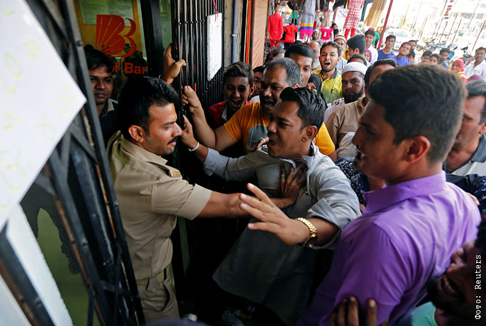Ограничение на съем наличных и обмен валюты в Индии привело к огромным очередям у банков и потасовкам с охраной и полицией. На прошлой неделе премьер-министр Индии Нарендра Моди сообщил о решении вывести из оборота банкноты номиналом 500 и 1000 рупий в рамках мер по борьбе с коррупцией, что стало полной неожиданностью для населения. Эти крупные купюры составляют 85% оборота наличных денег в стране. Вслед за этим решением правительство ужесточило и правило обмена: теперь один человек за один раз может обменять только 2 тысячи индийских рупий (около $30).