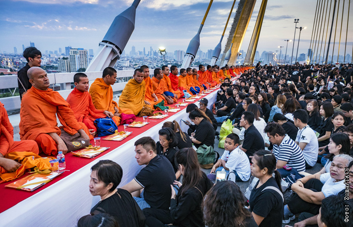 Тысячи человек собрались на мосту Пхумипона в Бангкоке в честь дня рождения короля Таиланда Пхумипона Адульядета, который скончался 13 октября в возрасте 88 лет