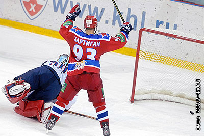 Гол в ворота голкипера "Металлурга" Василия Кошечкина (слева), забитый армейцем Марком Хартиганом (справа), в матче чемпионата КХЛ: ЦСКА (Москва) - "Металлург" (Магнитогорск)