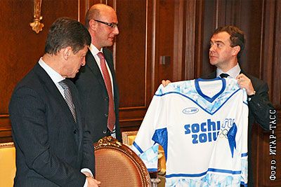 Майку с новой олимпийской символикой вручил президент Российского оргкомитета по проведению Зимних Олимпийских игр Дмитрий Чернышенко президенту России Дмитрию Медведеву. Чернышенко подчеркнул, что новая символика "Сочи.ру" родилась после года "отбора среди множества вариантов символик"
