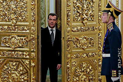 Президент России Дмитрий Медведев (в центре) перед началом заседания Высшего Государственного Совета Союзного государства Кремле
