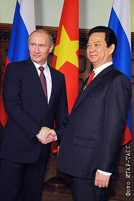 Премьер-министры России Владимир Путин и Вьетнама Нгуен Тан Зунг (слева направо) во время встречи