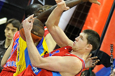 Игрок "Маккаби" Стефан Ласме и армеец Виктор Хряпа (слева направо) в матче Евролиги УЛЕБ: БК ЦСКА (Москва) – "Маккаби" (Тель-Авив)