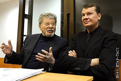 Адвокат Генрих Падва и актер Владислав Галкин (слева направо), обвиняемый в хулиганстве и сопротивлении сотрудникам милиции, перед заседанием Пресненского суда