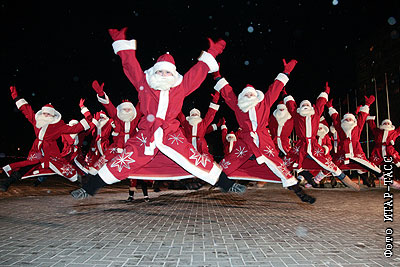 Участники парада Дедов Морозов на одной из улиц города Рыбинск