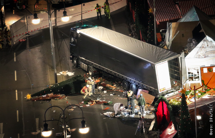Вечером 19 декабря грузовой автомобиль с польскими регистрационными номерами въехал в толпу людей на рождественской ярмарке в Берлине. В кабине грузовика, который проехал по рынку 50-80 метров, находилось два человека. Один из них, находившийся на пассажирском месте, обнаружен мертвым. Второго подозреваемого удалось задержать недалеко от места происшествия. Жертвами наезда стали 12 человек, еще 48 получили ранения разной степени тяжести и находятся в больницах.