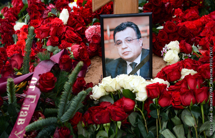 Церемония прощания с российским дипломатом прошла в здании МИД РФ на Смоленской площади. Отпевание погибшего состоялось в Храме Христа Спасителя. После отпевания похоронная процессия направилась на Химкинское кладбище, где Андрей Карлов был похоронен с воинскими почестями.