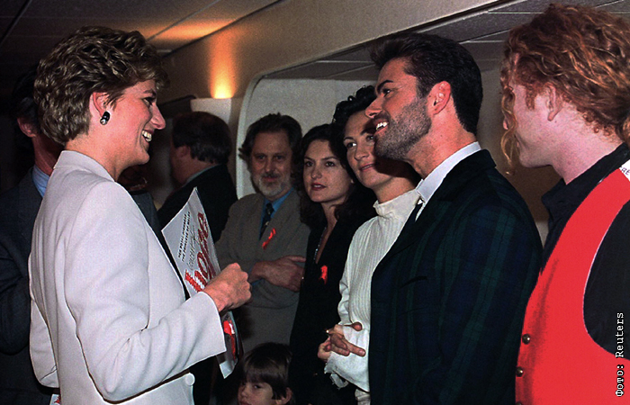 Принцесса Диана беседует с певцом перед концертом в поддержку борьбы со СПИДом в Лондоне. Декабрь 1993 года.