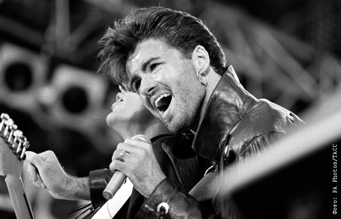 Джордж Майкл во время прощального концерта группы Wham! на стадионе "Уэмбли" в Лондоне. Июнь 1986 года.