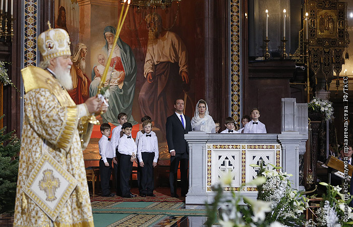 Москва. Храм Христа Спасителя. Патриарх Кирилл (на первом плане) премьер РФ Дмитрий Медведев с супругой Светланой (на втором плане) на праздничной службе.
