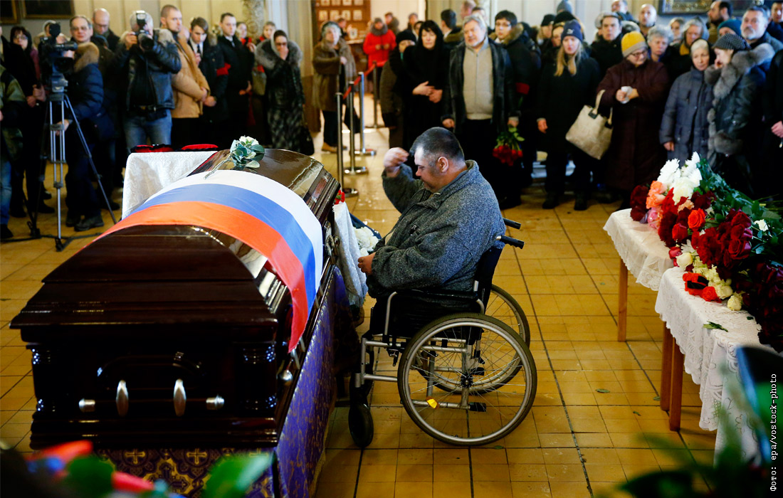В Москве и Московской области прошло прощание с погибшими в авиакатастрофе над Черным морем. 25 декабря 2016 года самолет Минобороны РФ Ту-154 потерпел крушение вблизи Сочи. Катастрофа унесла жизни 92 человек. При крушении самолета погибли девять журналистов, артисты ансамбля песни и пляски имени Анатолия Александрова, включая руководителя коллектива Валерия Халилова, глава фонда "Справедливая помощь" Елизавета Глинка, а также сотрудники Минобороны России.