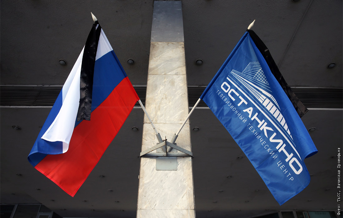 Флаги с черными лентами на здании телецентра "Останкино", где проходит гражданская панихида по погибшим в катастрофе журналистам
