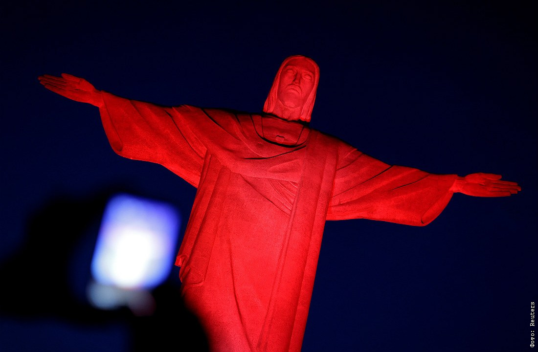 Статуя Иисуса Христа в Рио-де-Жанейро, подсвеченная красным, по случаю китайского Нового года