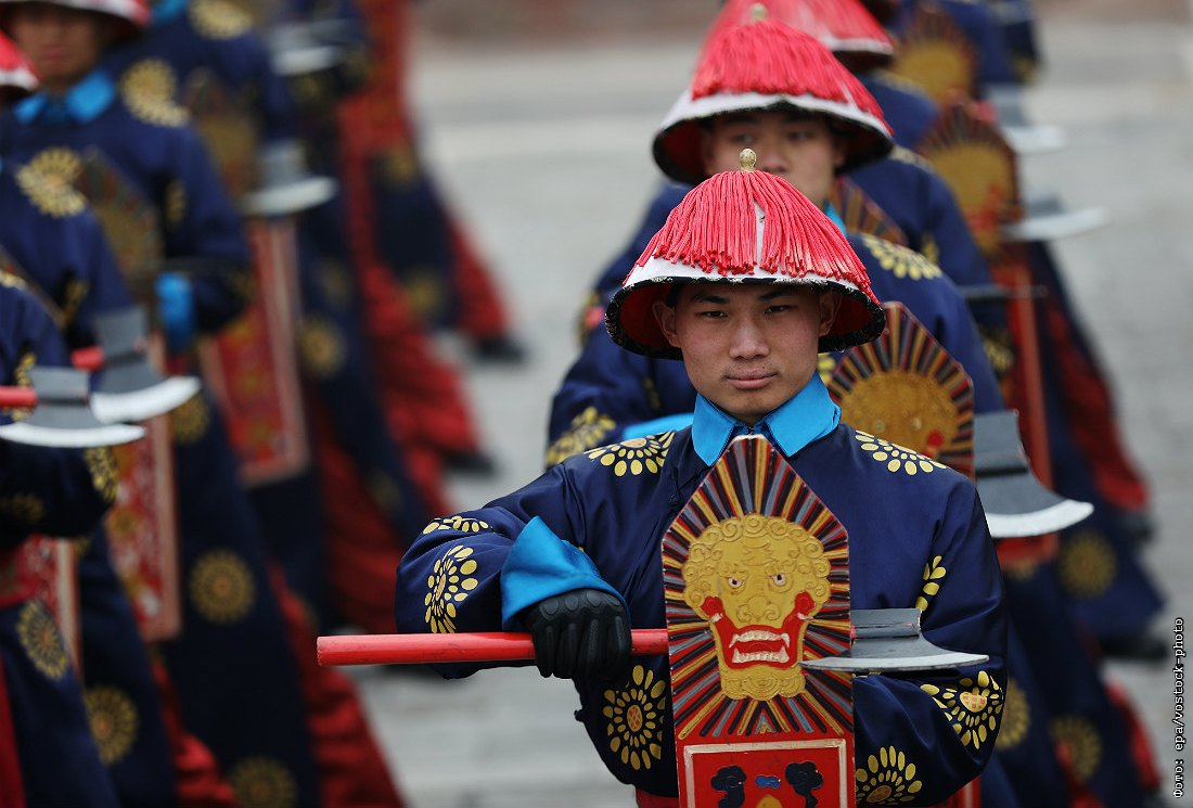 Актеры в костюмах периода империи Цин изображают ритуал жертвоприношения в храме Земли в Пекине