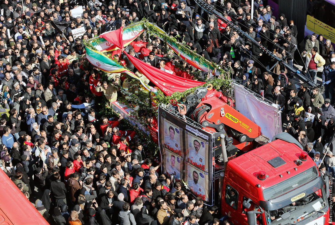 На церемонию прощания с 16 пожарными, ставшими жертвами обрушения старейшего высотного здания в Тегеране, пришли десятки тысяч человек. По сообщению "Би-би-си", погибшие, павшие смертью мучеников, будут похоронены на кладбище в особой секции.