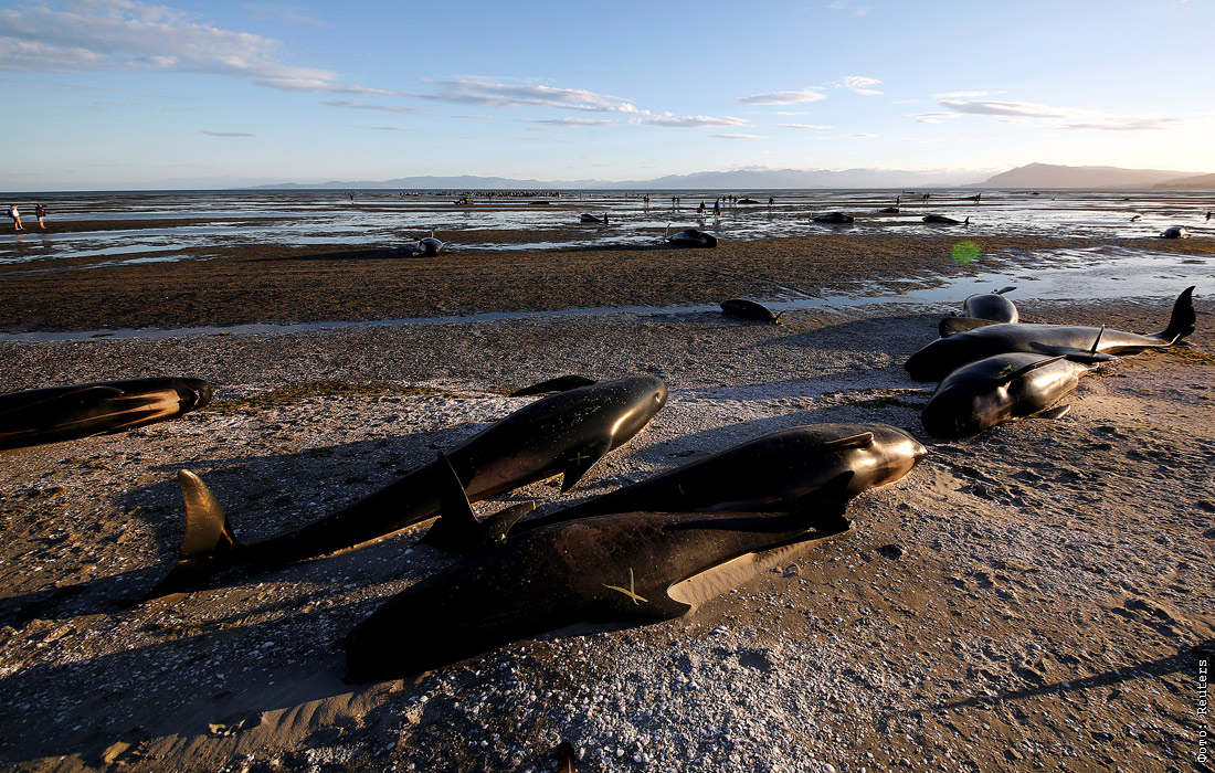 В Новой Зеландии 416 китов выбросились на берег Южного острова. Департамент охраны природы организовал спасательную операцию, но животных было так много, что потребовалась помощь местных жителей. Люди несли на пляж ведра, полотенца и простыни, чтобы охлаждать и увлажнять тела китов. Однако не менее трехсот из них погибли. Этот случай стал самым масштабным "массовым самоубийством" млекопитающих за последние десятилетия.
