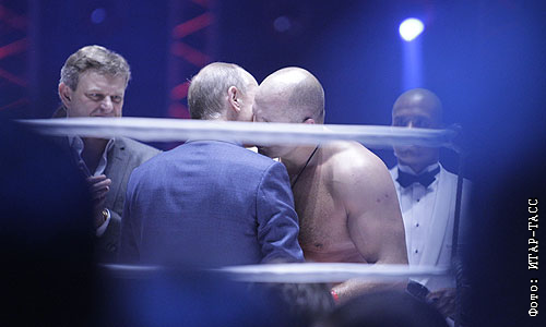 Владимир Путин и российский боец смешанных единоборств (ММА) Федор Емельяненко, победивший американца Джеффа Монсона, после боя в рамках турнира M-1 Global "Битва легенд".