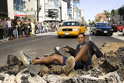 Актер Уилл Смит в роли Хэнкока в сцене из фильма Питера Берга "Хэнкок"