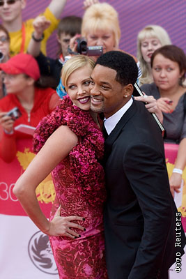 Американский актер Уилл Смит (справа) и актриса Шарлиз Терон на открытии Московского кинофесфестиваля, где они представят фильм "Хэнкок"